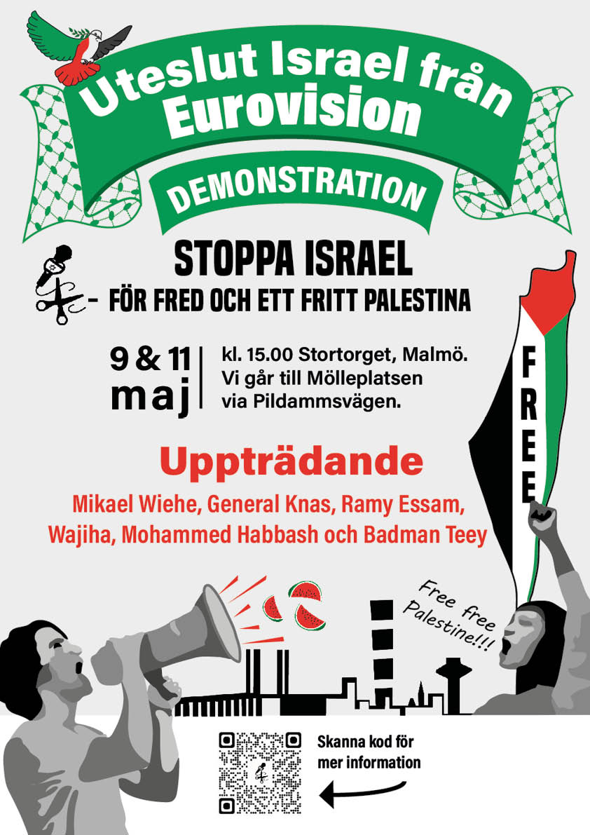 Vi uppmanar alla att delta i de kommande protesterna. Tillsammans visar vi världen att vi står enade i solidariteten med det palestinska folket och att Israel INTE är välkomna till Malmö!